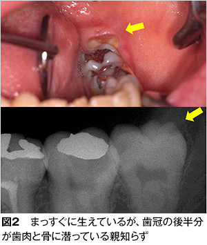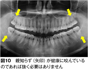 | 1. | 親知らずが上下できちんと生え、かみ合っている:写真(図10)のように親知らずが顎に直立して生え、お互いにかんでいる場合。 |
