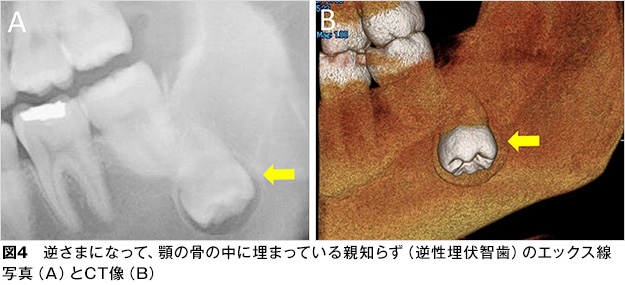 親知らずは一般的には、上あごの左右2本と下あごの左右2本の計4本ありますが、もともと親知らずの無い人や、必ずしも4本が揃っていない人など個人差があります。親知らずの生えてくる場所が不足している、あるいは萌出方向(生える方向)が通常と異なるために、埋伏(埋まった状態)していたり、傾いてきちんと生えてこないことがしばしばみられます(図2〜5)。