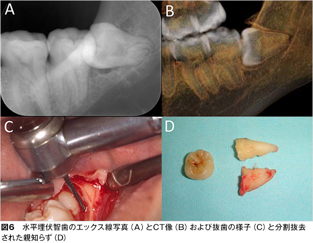 親知らずの抜歯は正常に生えている場合には、普通の歯を抜くのと同様に比較的簡単に抜くことができます。しかし、親知らずの大部分が骨の中に埋まっていたり、歯の根っこの形が複雑だったりすると、歯肉を切開したり、骨や歯を削ったりするため抜歯するのにもかなりの注意と手間が必要となります(図6)。なお、親知らずの状態や患者さんに持病があったりする場合、入院や全身麻酔下での管理が必要となる場合もあります。