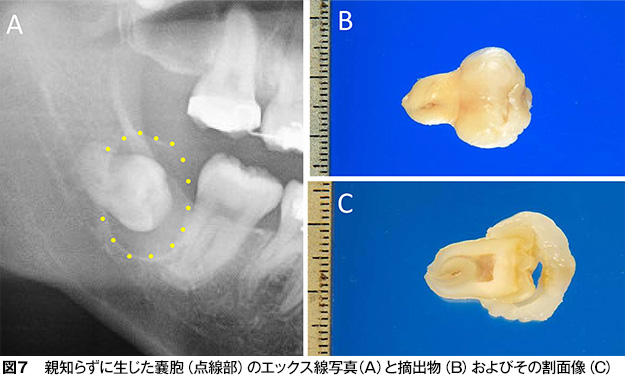 埋伏した親知らずの歯の周りにエックス写真で袋のような影が確認される場合があり、このような状態の病気を嚢胞と言います。(図7)嚢胞は一般に無症状に経過しますが、感染(化膿すること)による痛みや病変の拡大に伴う顎骨の腫脹(腫れ)を生じることもあります。基本的には良性の病変ですが、腫瘍との鑑別診断が必要であり、病変の一部を切除するか、親知らずとともに全摘出した上で、病理検査を行うことをお勧めします。