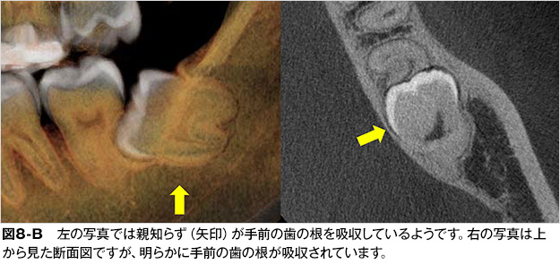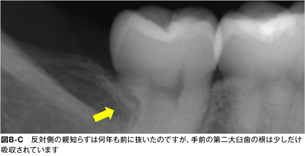 | 2. | 横向きに埋まっていて前方の歯に障害を及ぼしている:親知らずが横向きに埋まっていると智歯周囲炎や手前の第二大臼歯の吸収(歯の根が溶かされるように浸食されること)を引き起こすので、親知らずを抜くことが多いです。しかし、手前の第二大臼歯の吸収が進みすぎると注意が必要です。写真(図8-A)の親知らずは生える場所がないうえに方向が悪いので普通なら抜くところですが、CT(図8-B)では親知らずの手前にある第二大臼歯の根に大きな吸収が認められます。この第二大臼歯はあまりにも吸収が進んでしまったので長期的には保存できないと判断しました。この状況で親知らずを抜くと手前の第二大臼歯が将来的に失われた際に奥歯のかみ合わせが不十分となるために、入れ歯やインプラント等の治療が必要になります。幸いCTにより予め状況を把握していたので、第二大臼歯を抜いた後に部分的な矯正治療にて親知らずを正しい方向に移動して良好なかみ合わせを維持しました。ところで反対側の第二大臼歯を良く観察すると歯の根の一部に吸収した痕が見られます。(図8-C)奥にあった親知らずは何年も前に抜いたので手前の第二大臼歯へのダメージも少なかったのだと思われます。 |