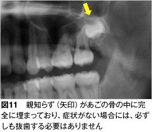 | 2. | 顎の骨の中に完全に埋まっていて問題が無い:写真(図11)は、親知らずが顎の骨の中に完全に埋まっている状態です。この親知らずは周りの歯や骨に悪い影響を与えることはないと考えられ、痛みや腫れなどの症状がなければ直ちに抜く必要はありません。 |