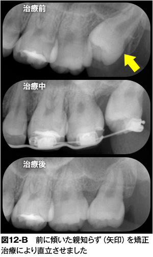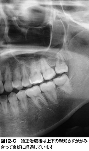 | 5. | 矯正治療で親知らずを正しい位置に動かすことができる:親知らずの生える方向が悪くても矯正治療によりきちんとかめるように治すことができます。写真は上顎の親知らずの生える方向が通常よりも前方に向いてしまったために手前の第二大臼歯に接触し、親知らずがこれ以上生えられない状態です。(図12-A)親知らずの生える場所が十分にあり、下顎にかみ合うべき親知らずも正常に生えているので、上顎の親知らずを矯正治療で移動させました。(図12-B)矯正治療後は上下の親知らずがかみ合って良好に経過しています。(図12-C)矯正治療は歯を動かす治療ですがどのような状況でも可能とは限りません。矯正治療で治せるかどうかは歯科医師に相談することをお勧めします。 |